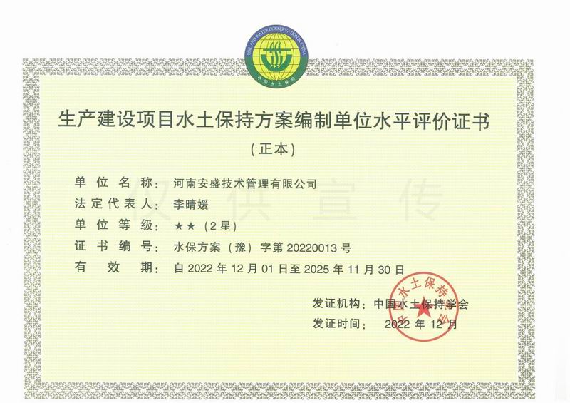 熱烈慶祝河南安盛技術(shù)管理有限公司榮獲生產(chǎn)建設(shè)項目水土保持方案編制單位水平評價證書