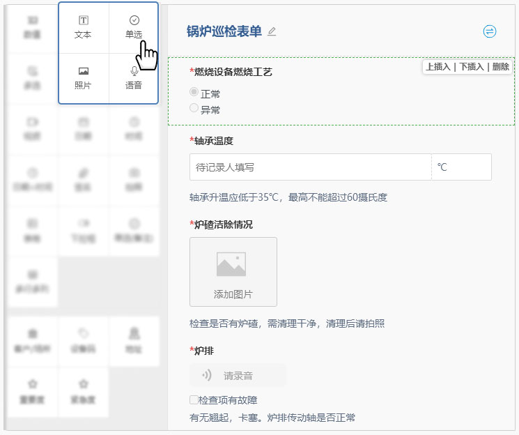 2、在巡檢表單設(shè)計中,您可以為大部分的檢查項設(shè)定合格范圍。不合格表單可以被單獨訂閱、統(tǒng)計或作為觸發(fā)工單系統(tǒng)的條件。比如:溫度值范圍,單選、多選的不合格項等等。此外,在表單設(shè)計中您還可以為巡檢項填寫檢查方法及檢查標(biāo)準(zhǔn),供巡檢人隨時查看。